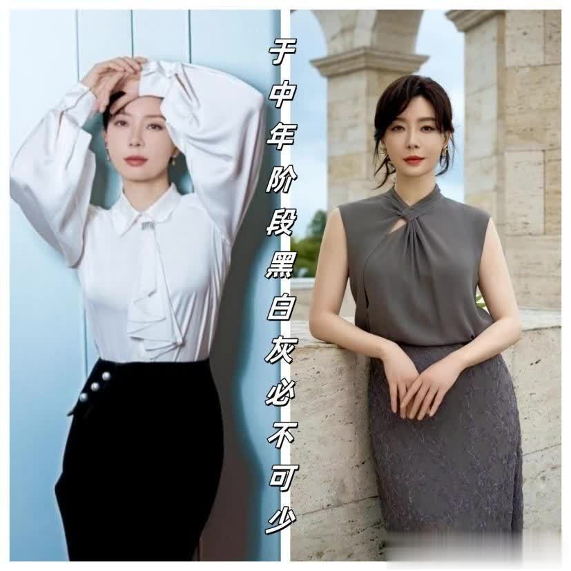 在色彩的搭配上,建议中年女性可以以基础色作为主色调来让造型呈现简洁大方的感觉。例如深浅程度不同的灰色进行搭配,会让造型给人沉稳庄重的视觉效果。或者选择白色和黑色相互碰撞,简约大气的完美融合之下又很有层次感,相当的高级。